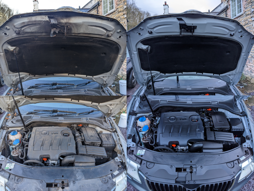 The below picture shows just how well Surfex-HD performs when tackling engine bays. This Skoda Superb had covered a whopping 216,000 miles (347,000km) without a single engine bay detail. This was tackled with a 5% dilution, except for the bonnet catch, which required a small amount applied neat. The only other product used here was a water-based dressing to smarten up the tired plastics.