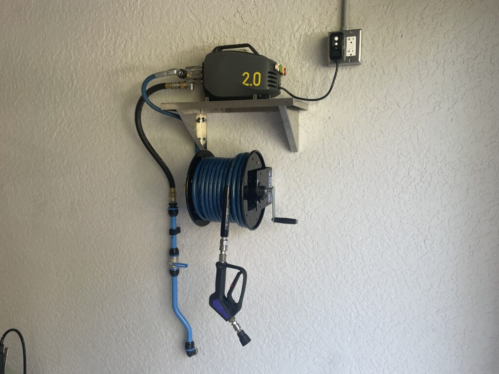 This is another critical part in the system. You want a minimum of a 50ft hose for the reel, only factor limiting the length is your choice of hose reel. You also want 3/8 threaded ends on both sides. Popular picks include the Kobrajet, Flexzilla, Uberflex, etc… hoses. Make sure you can get around a vehicle with the hose or get a longer one.